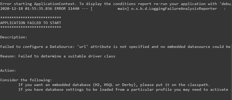위와 같은 에러가 나타났습니다. 해당 오류는 Gradle 프로젝트 생성 후 DB 관련 dependencies를 설정하지 않아서 뜨는 오류입니다.