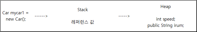 Car mycar1; // Car 클래스 타입인 mycar1 레퍼런스 변수를 선언 mycar1 = new Car(); // new 연산자를 사용해서 메모리상에 mycar1 객체를 생성 |