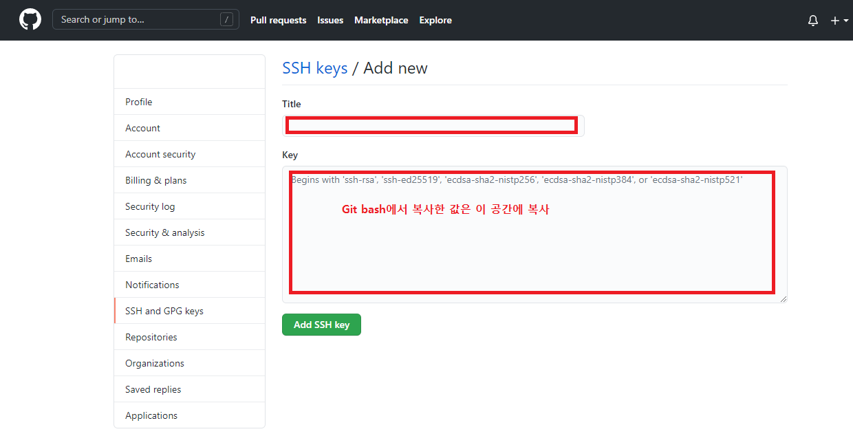 위와 같은 키가 쭉 나오면 ssh-rsa부터 끝까지 복사 하신 후 github ssh key에 등록해줍니다.