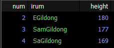 - 'SaGildong' 보다 키가 크거나 같은 사람을 출력