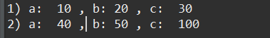 print('2) a: ' , a, ', b:', b, ', c: ', c)
